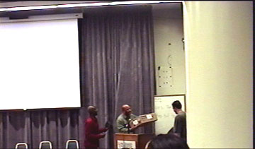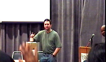 | Screening/Q&A_____________________ On November 9th, 2002, Filmmaker Clarke M. Smith, Co-Producer Leilani L. Smith and actress Bennie Jablonski traveled down to Long Island University for the festival. They caught the tail end of the film before ours, some sort of silly vampire romp (should have been there, Ron). Unfortunately, a lot of people left after that. EP came on about 7:30pm. There were about 25 people now in the audience (was hoping for more) but they were a good crowd. As usual, they gave an unsure applause at the fake ending, then a delayed one at the real endind. It never fails! |