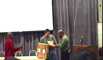 | Immediately after the screening, they called Smith up the stage to accept he certificate above. One particular group of film students(all girls) were eager with questions, but all of a sudden, one of the school instructors approached him with a box...looked like a DVD player...said Panasonicon it...it turned out the be the Narrative Feature Winner prize - a Panasonic DVD Recorder!!! |